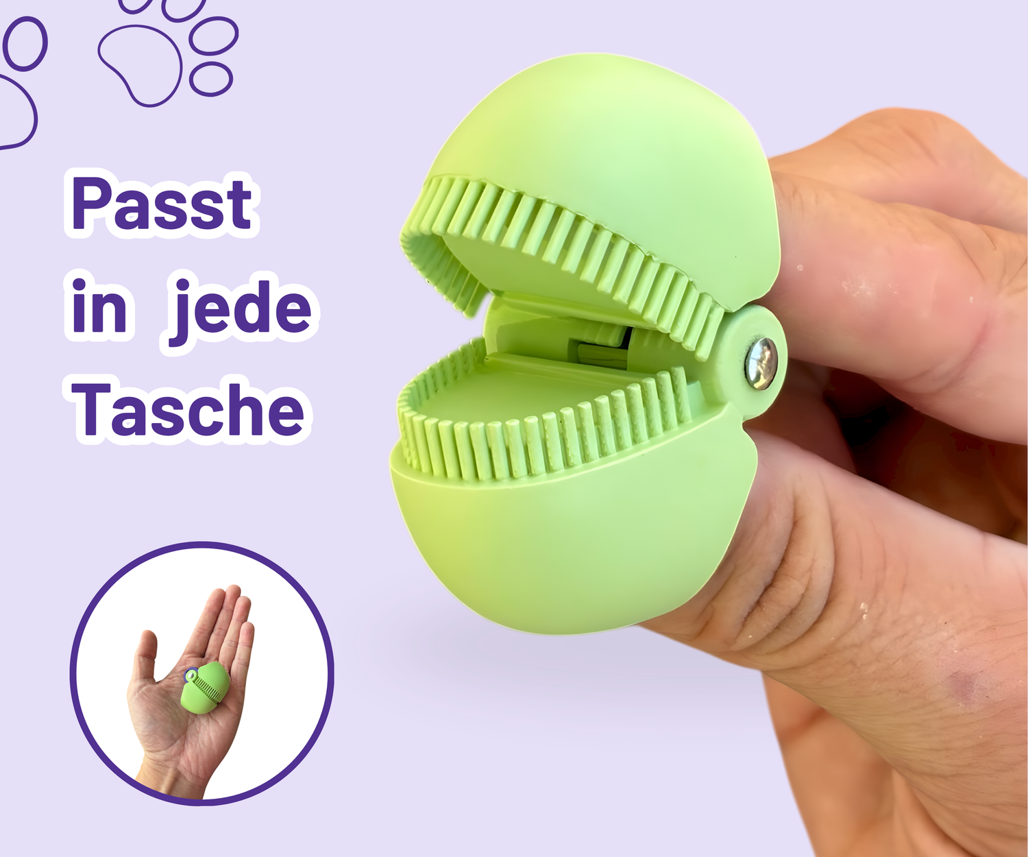 Ticky wiegt gerade einmal 20 g und passt dank seiner kompakten Größe in nahezu jede Tasche – der perfekte Begleiter auf jedem Spaziergang mit deinem Vierbeiner.